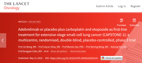 北京时间2022年5月14日,ag真人国际官网医药自主研发的PD-L1抑制剂阿得贝利单抗治疗广泛期小细胞肺癌的III期临床研究(CAPSTONE-1研究)成果正式全文在线发表于国际权威学术期刊《柳叶刀·肿瘤学》(《THE LANCET Oncology》,影响因子41.316)。CAPSTONE-1研究结果显示,阿得贝利单抗联合化疗一线治疗广泛期小细胞肺癌相较于安慰剂联合化疗可以显著延长患者总生存期至15.3个月[1],刷新现有免疫药物一线治疗广泛期小细胞肺癌的总生存纪录[2]。